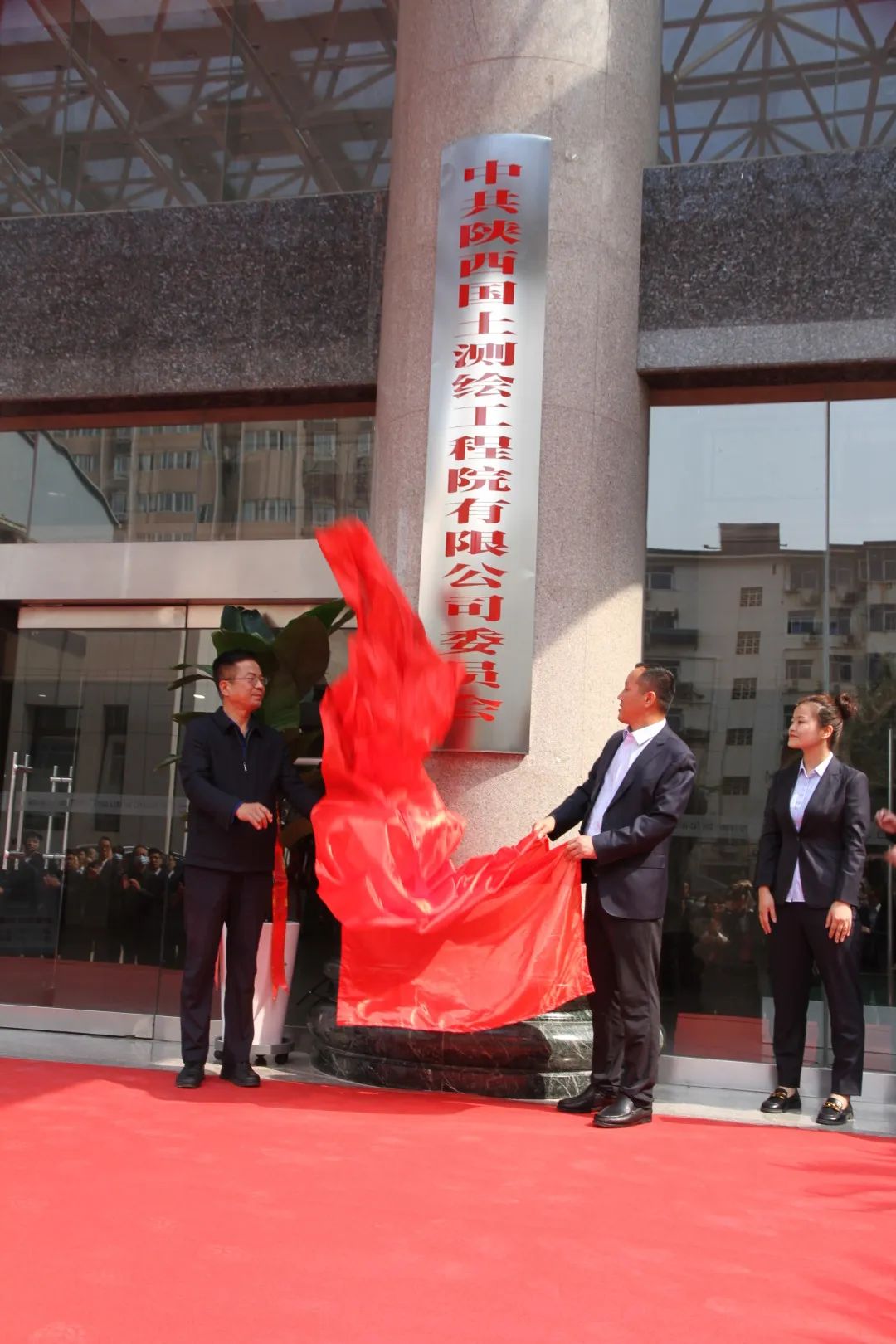 在雄壯的樂曲聲(sheng)中(zhong),集(ji)團公司黨委副書記(ji)安(an)增會(hui)、測繪院黨委書記(ji)、執行董事(shi)、總經理馮永強(qiang)共同為“中共陜西國土測繪工程院有限公(gong)司委員會”、“陜西國土測(ce)繪工(gong)程(cheng)院有限(xian)公(gong)司”揭牌。馮永強(qiang)宣布陜西國土測(ce)繪工(gong)程(cheng)院有限(xian)公(gong)司正(zheng)式入駐地質(zhi)資料樓。